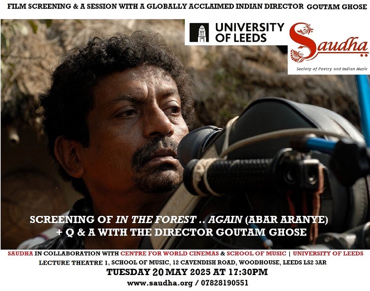 Curated by Associate Professor of World Cinemas Dr Christopher Homewood and lecturer of music aesthetics of school of music at University of Leeds Dr Matt Pritchard and the director of Saudha poet Ahmed Kaysher, this session is featuring a screening of internationally acclaimed Indian Bengali film In The Forest Again, a unique interpretation of Satyajit Ray's Days and Nights in the Forest by a leading interpreter of Post-Satyajit Indian cinema Goutam Ghose ( https://en.wikipedia.org/wiki/Goutam_Ghose), a critically acclaimed director of Padmanodir Majhi, Moner Manush, Antarjali Jatra, Raahgir and many more.