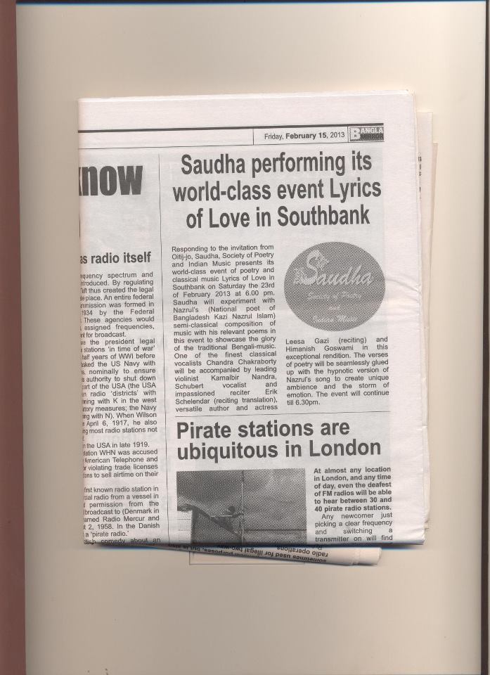 Being invited by Oitij-jo; Saudha performed at OxoTower in Southbank one of its world-class experimental event that delved into the amalgamation of poetry and Indian Clasical Music. A UK based singer Chandra Chakraborty sung kheyal, Nazrul Geeti on relevant ragas while verses of Bengali poet Nazrul Islam (both original and English translation) were recited seamlessly and harmoniously by inflamed reciter and Schubert singer Erik Schilander and versatile writer and actress Leesa Gazi (original verses). Chandra was accompanied by prominent violinist Kamalbir Nandra and young talented Tabla Player Himanish Goswami.