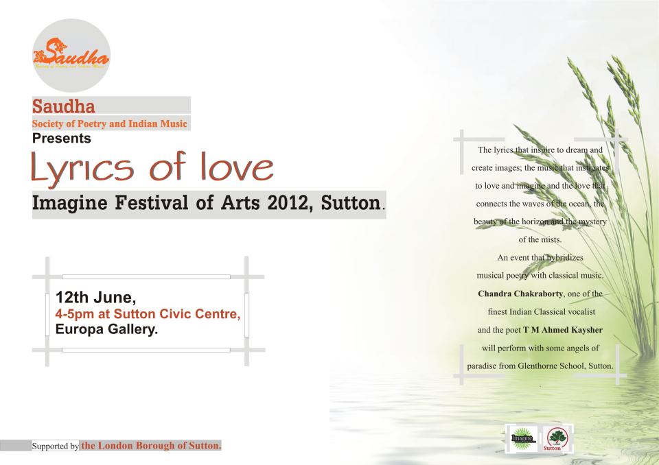 An event that amalgamated poetry and classical music together led by a UK based Indian singer Chandra Chakraborty and poet T M Ahmed Kaysher engaging 20 young children from Glenthorne school in Sutton, UK.http://www.sutton.gov.uk/CHttpHandler.ashx?id=18162&p=0